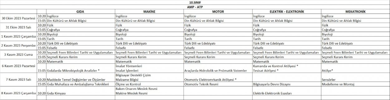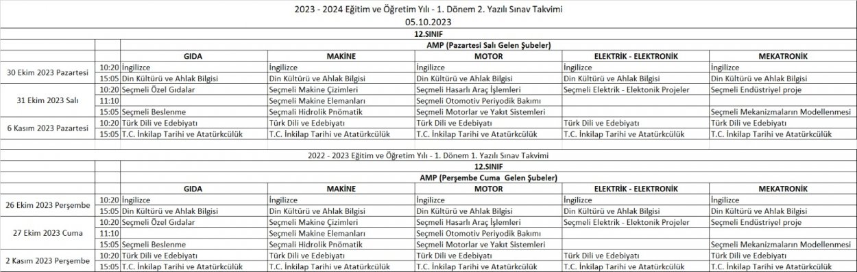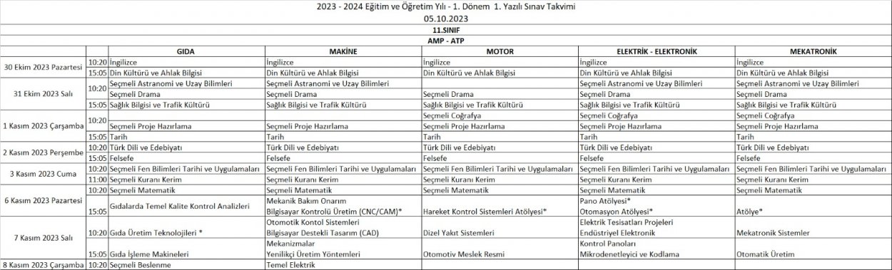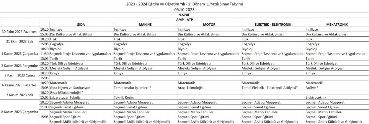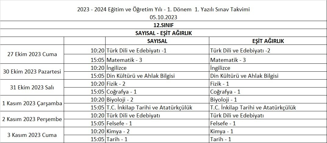 2023-2024 Eğitim ve Öğretim Yılı 1. Dönem 1. Yazılı Tarihleri