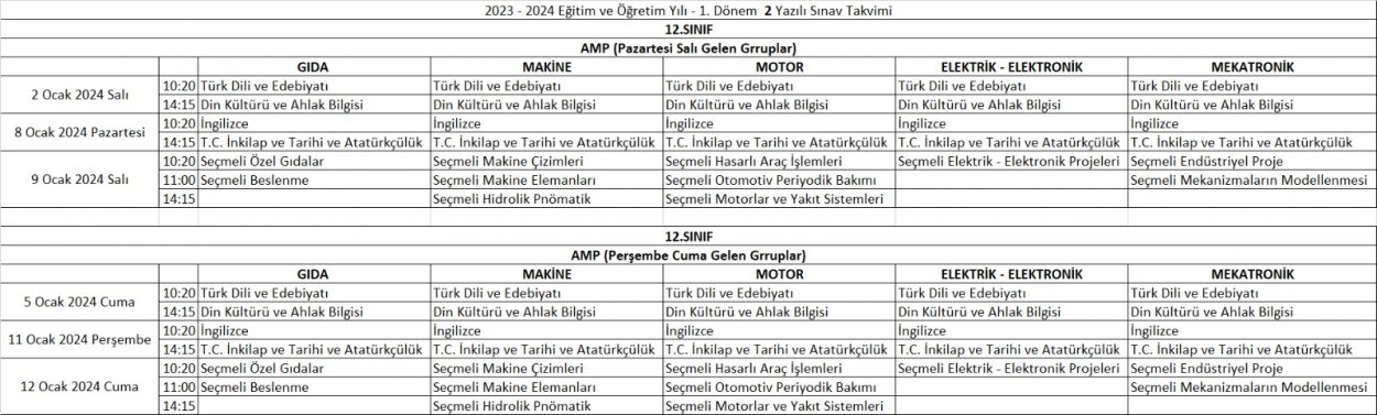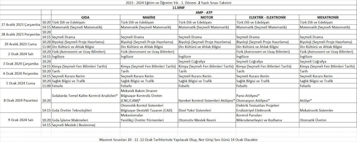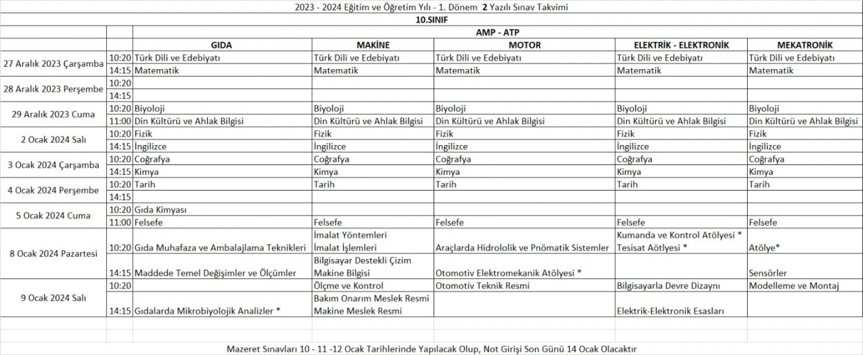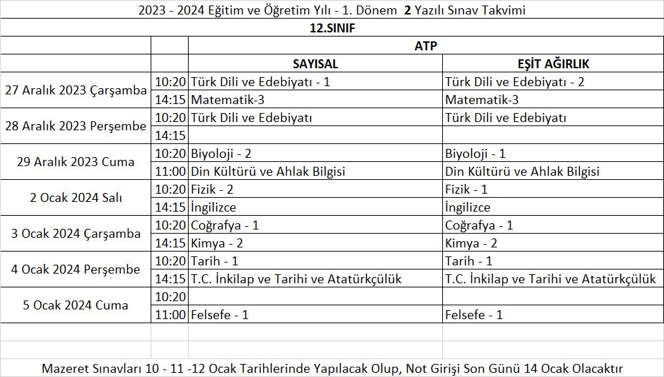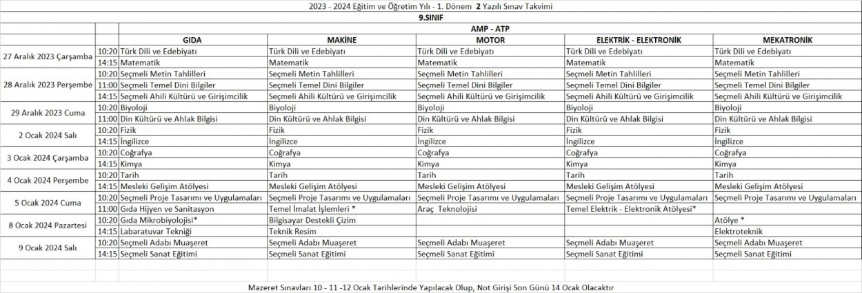 2023-2024 Eğitim ve Öğretim Yılı 1. Dönem 2. Yazılı Tarihleri