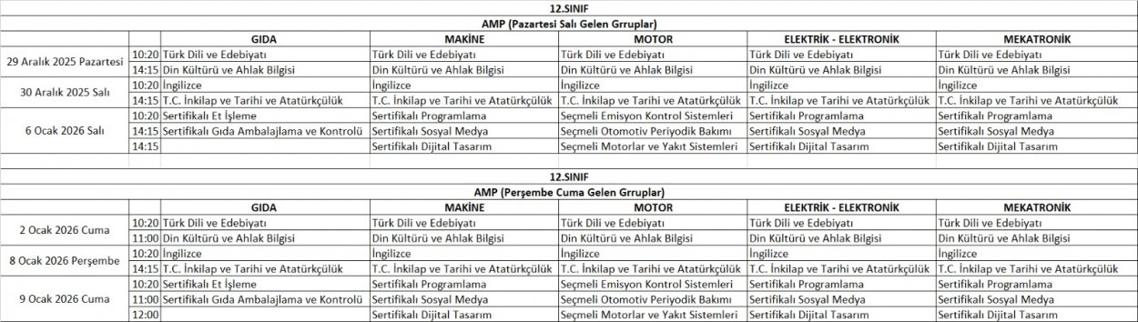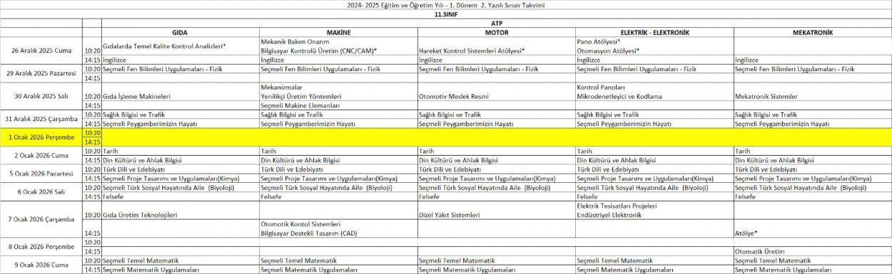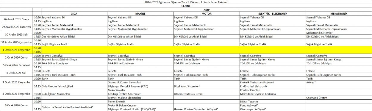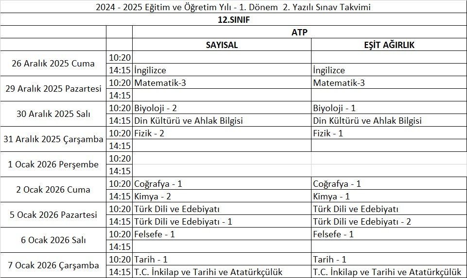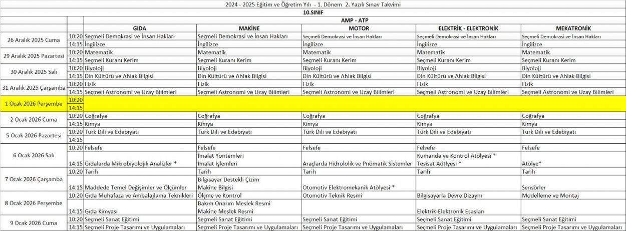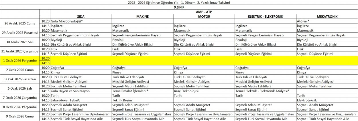 2025 - 2026 Eğitim ve Öğretim Yılı 1. Dönem 2. Yazılı Tarihleri