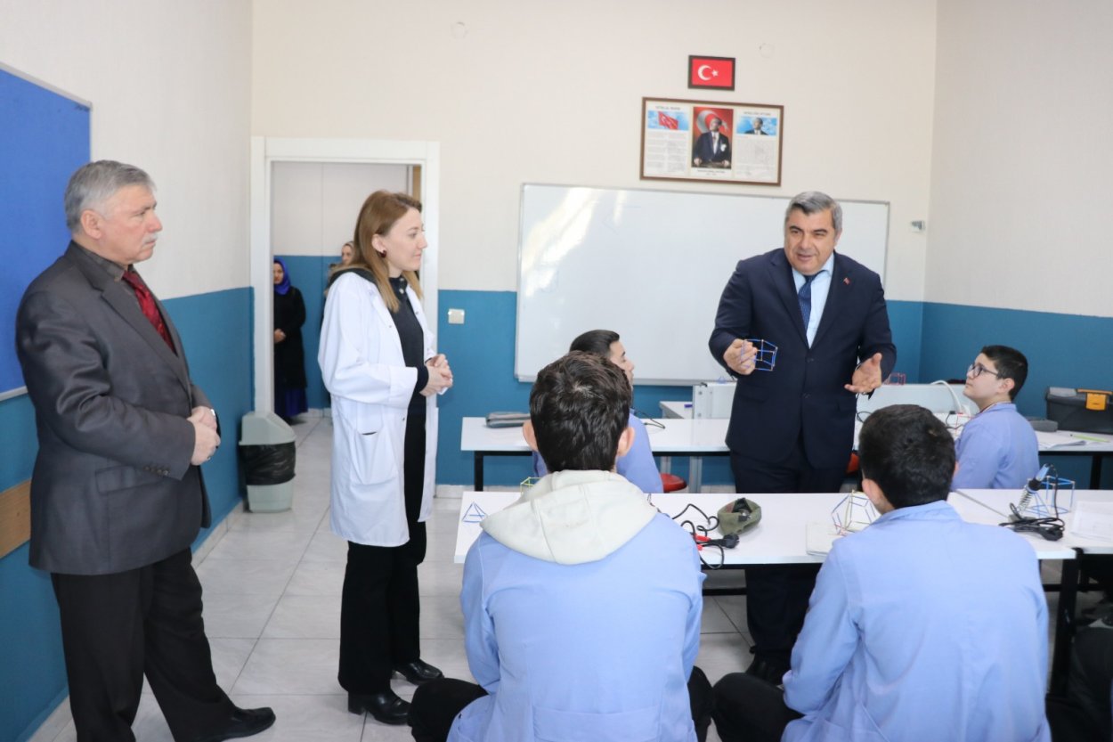Okulda gerçekleşen ziyaret kapsamında, Sünnetci sınıflar, atölyeler ve işlikleri (özellikle teknoloji tasarım atölyeleri) gezen Müdür Sünnetci, okulun yürüttüğü çalışmalar ve projeler hakkında bilgi aldı.