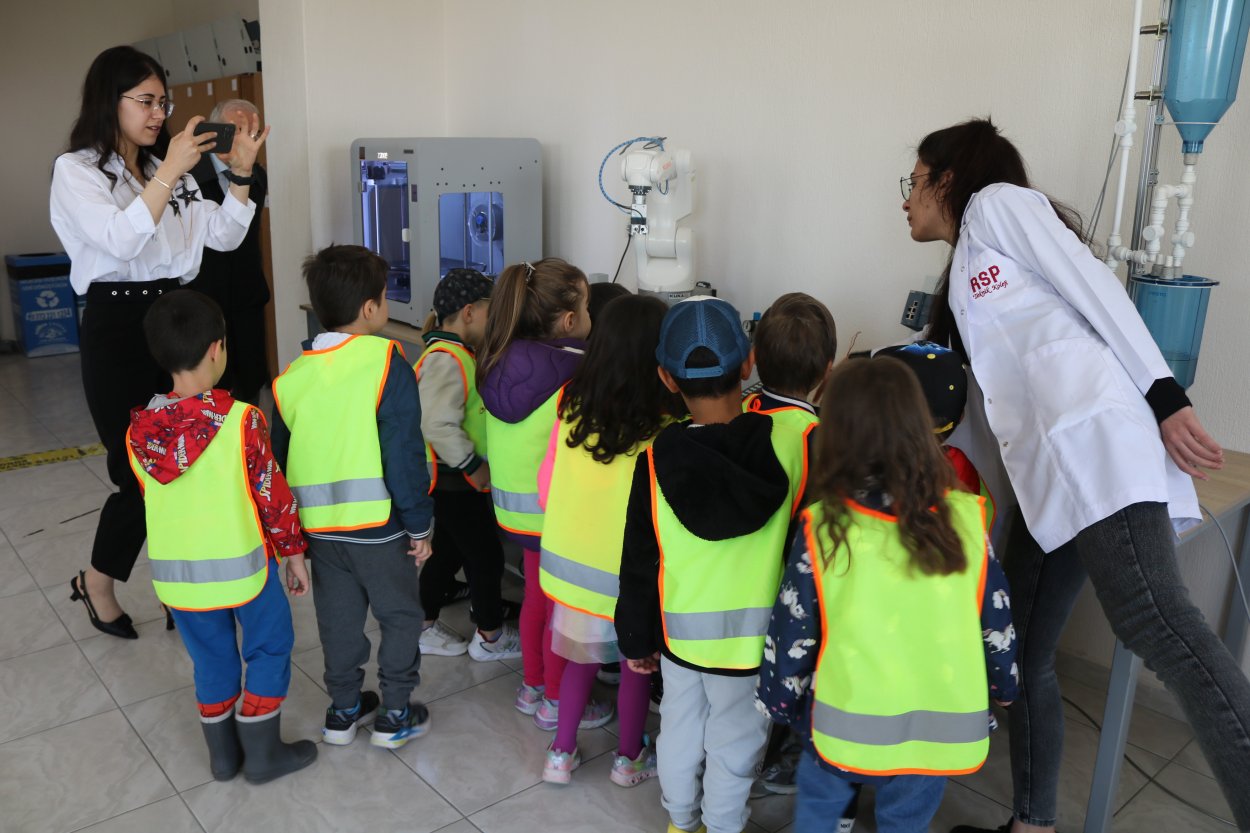 Minik Atom Karınca Anaokulu 4 ve 5 yaş grupları teknik kolejin Mekatronik, Gıda ve Motor Teknolojisi alanlarını gezdiler.