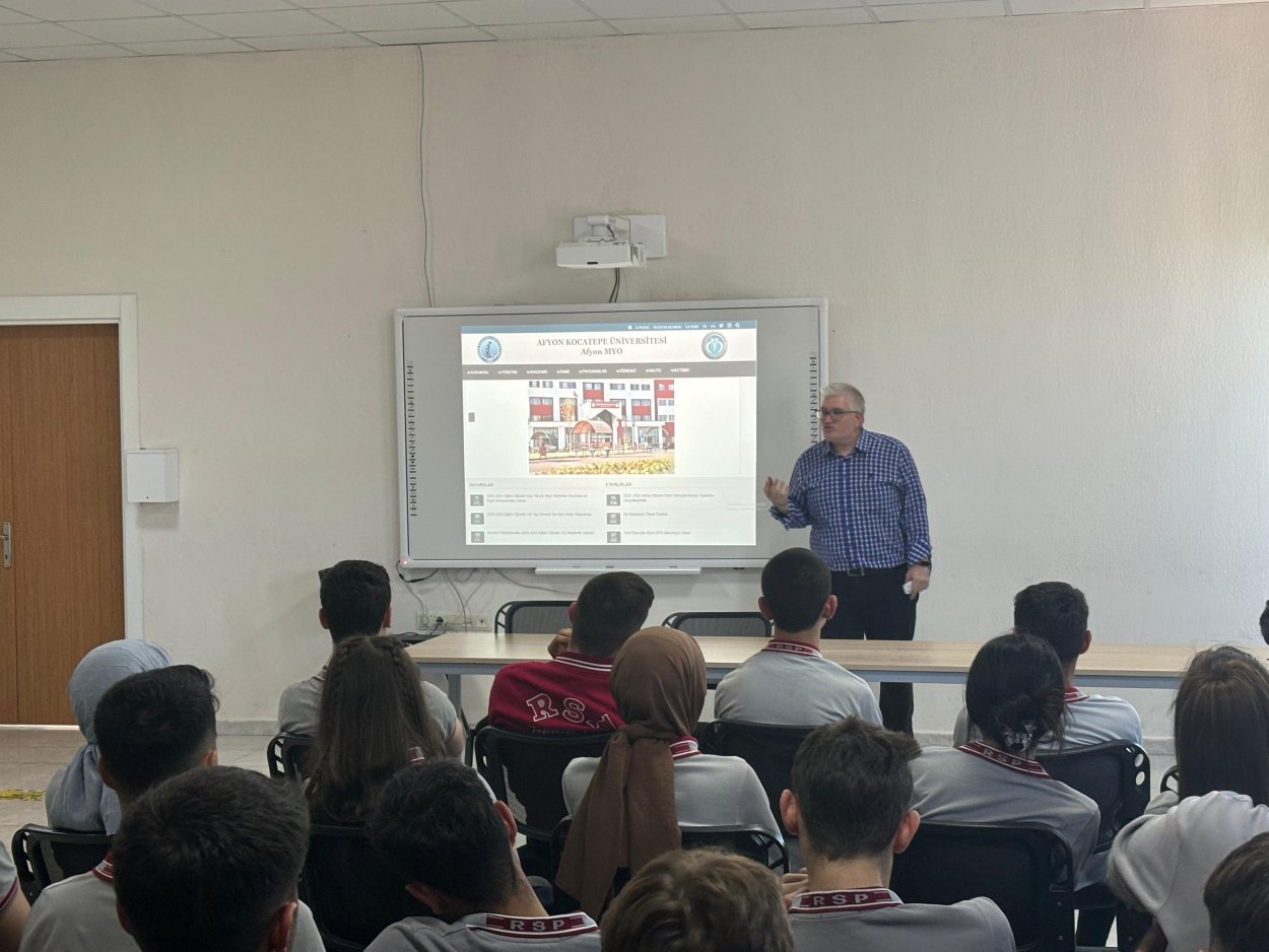 Tanıtımlar hakkında bilgi veren okul müdürü İbrahim ÇAKAL, Mesleki tanıtımlar kapsamında Afyon Meslek Yüksekokulu’ndan Müdür Yardımcısı Öğr.Grv. Besim MADEN ve Öğr.Grv.Dr. İbrahim PAZARKAYA okulumuza gelerek öğrencilerimize özel sunum gerçekleştirdiler. Sunum sonunda ise ; okulumuzdan MYO bölümlerine giden öğrencilerin donanımlı geldiklerini ve bundan memnuniyet duyduklarını belirtmişlerdir. Ayrıca YKS sınavlarında tüm öğrencilerimize başarılar dilemişlerdir. Okulumuz olarak bizde kendilerine teşekkür ederiz. dedi