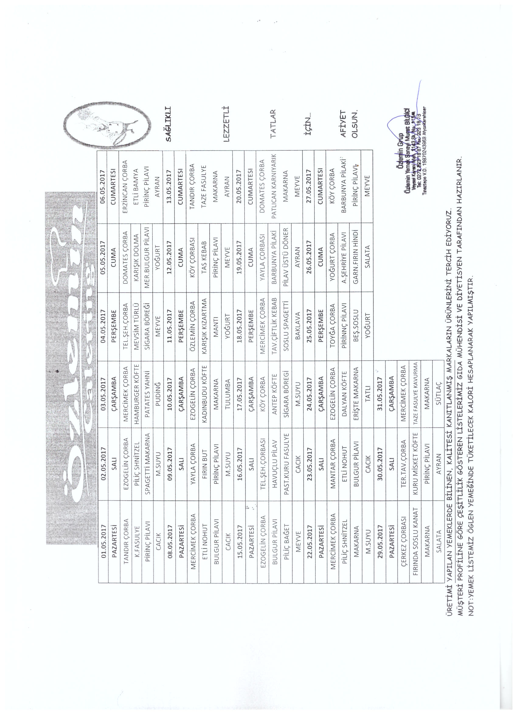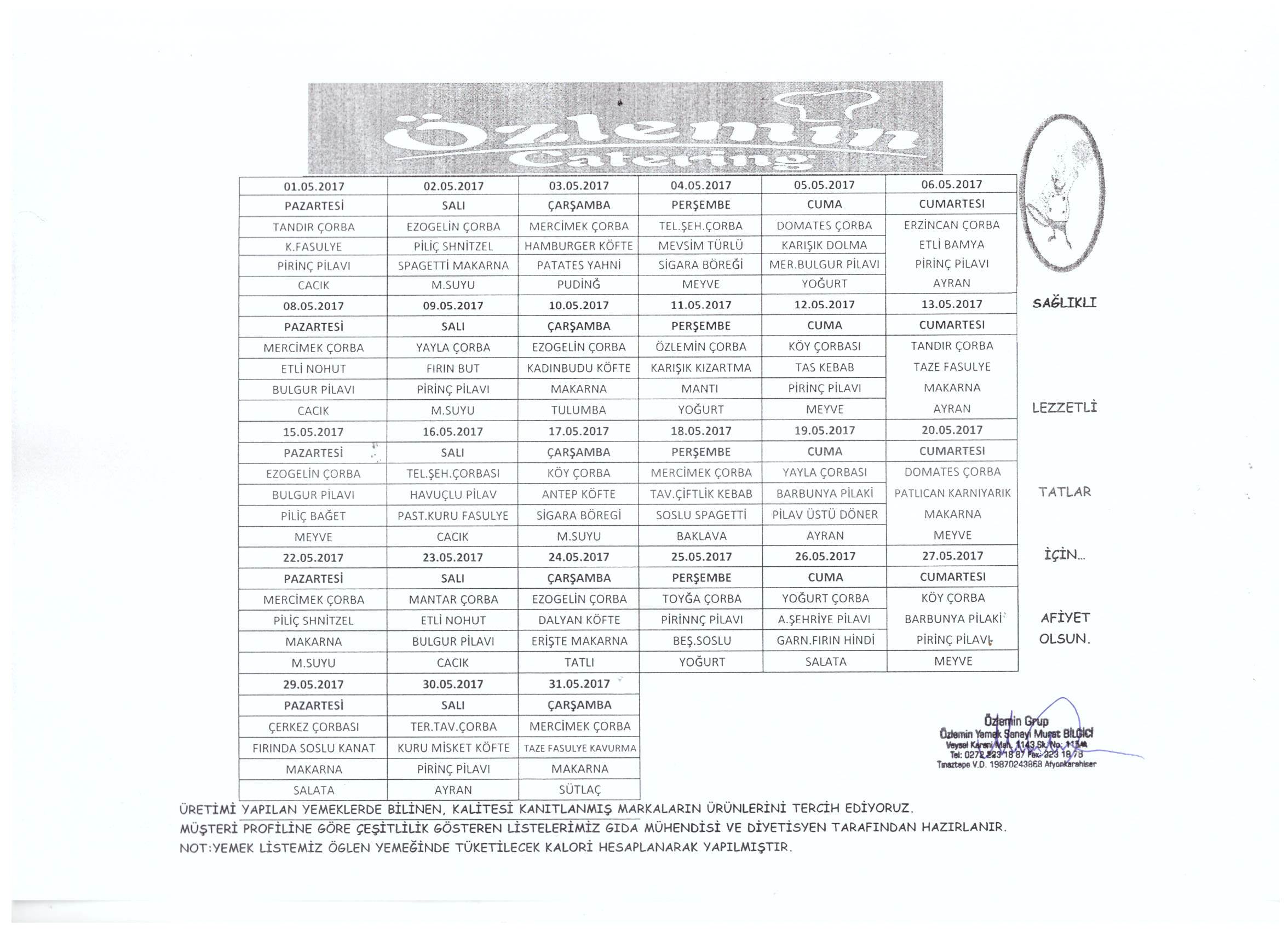 2017 - Mayıs Ayı Yemek Listesi Yayınlandı