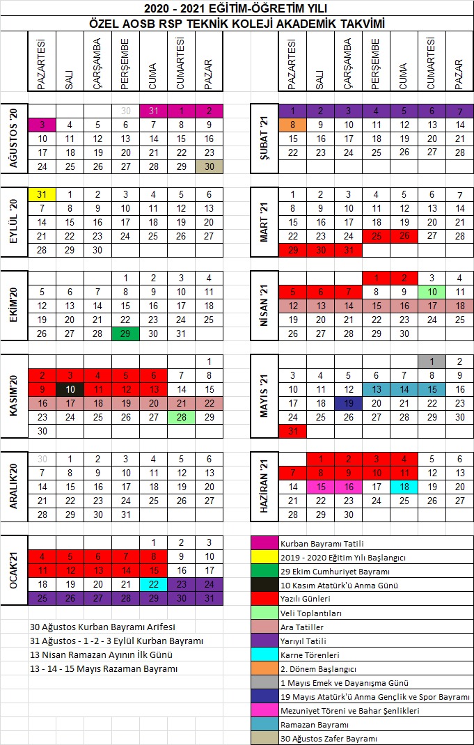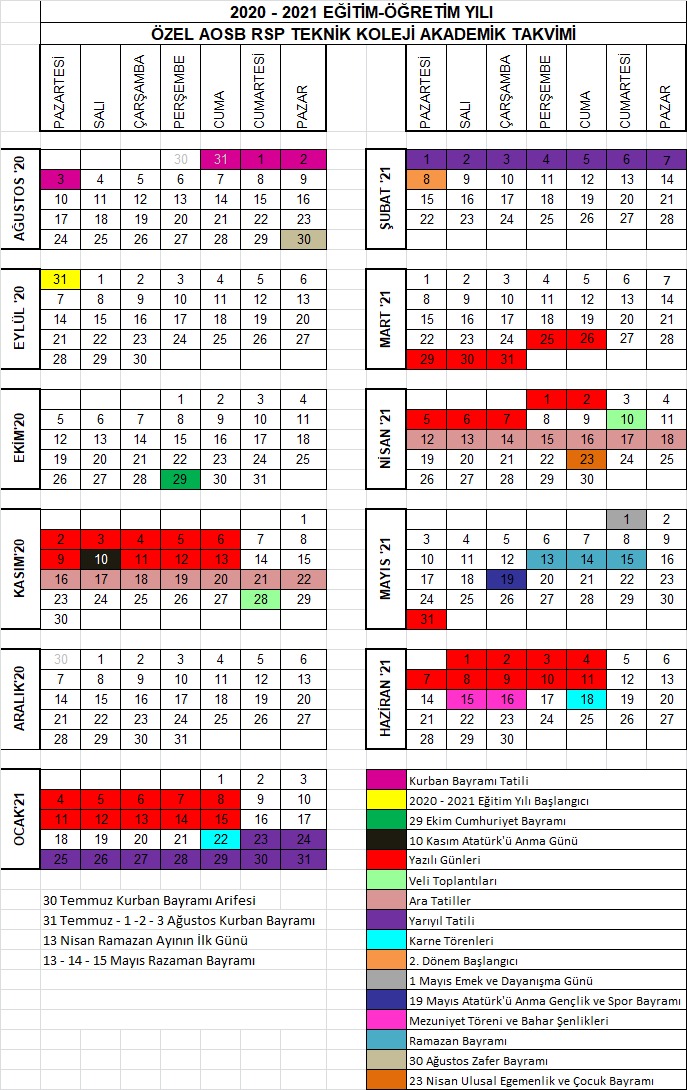 RSP KOLEJİ AKADEMİK TAKVİM 2020 - 2021