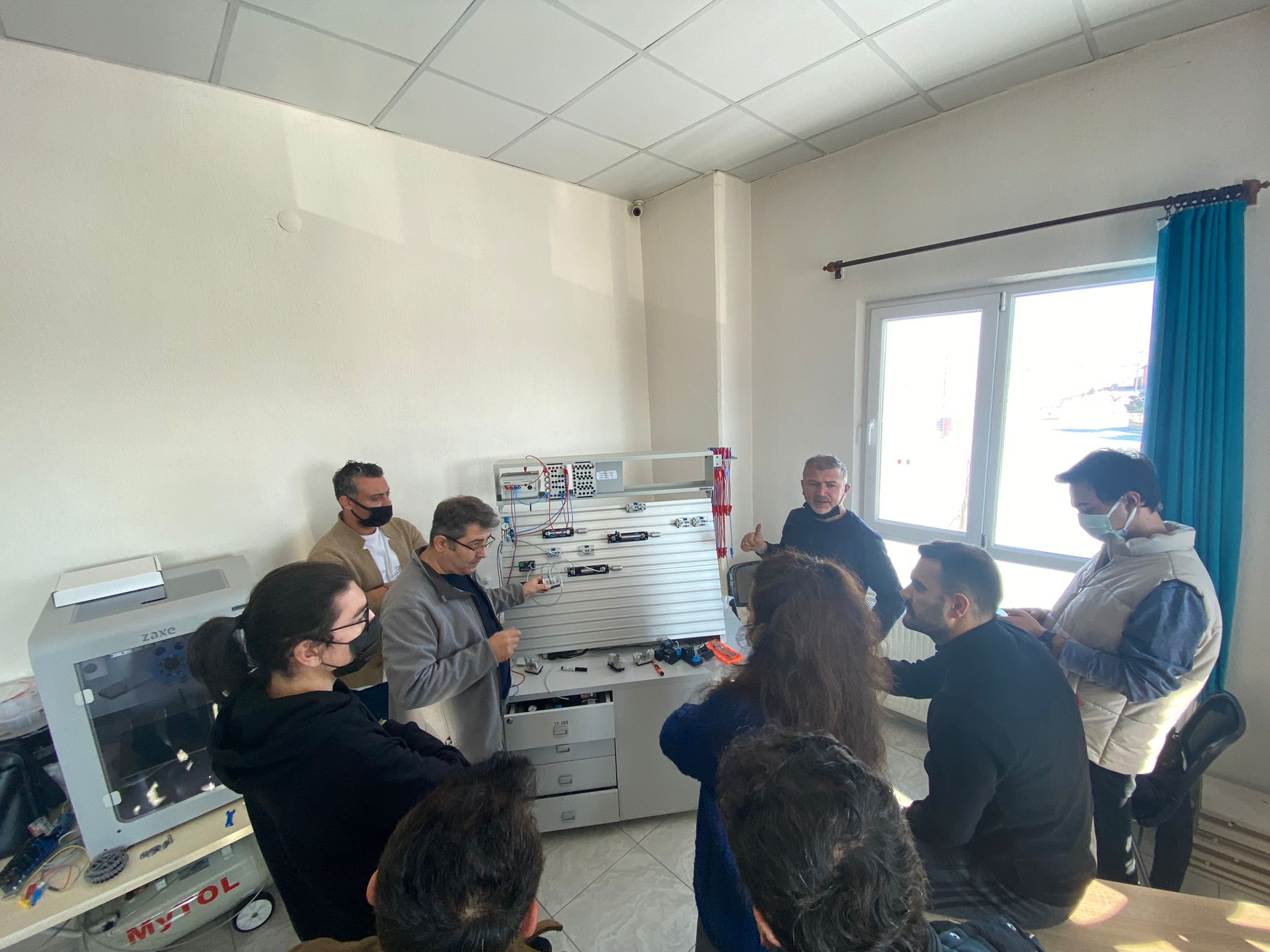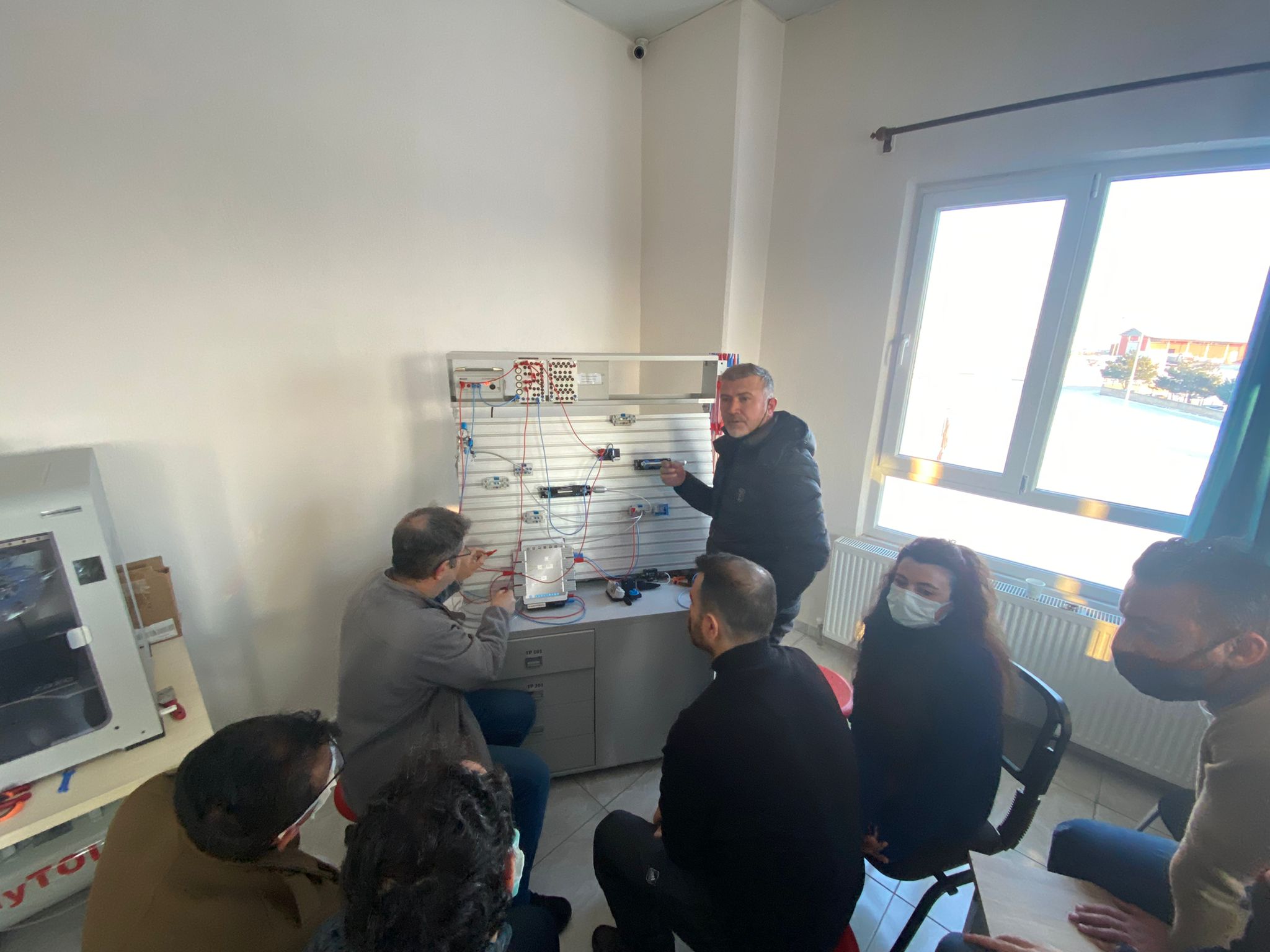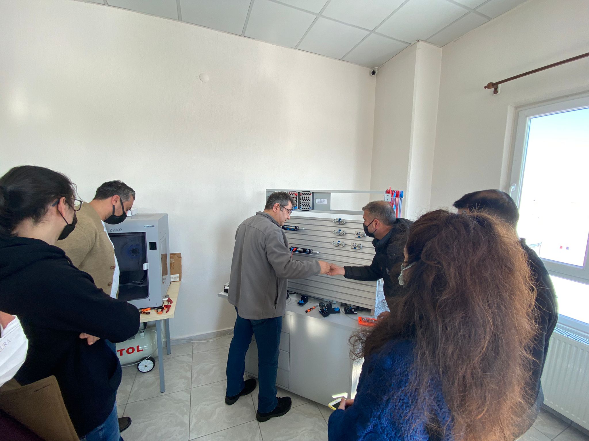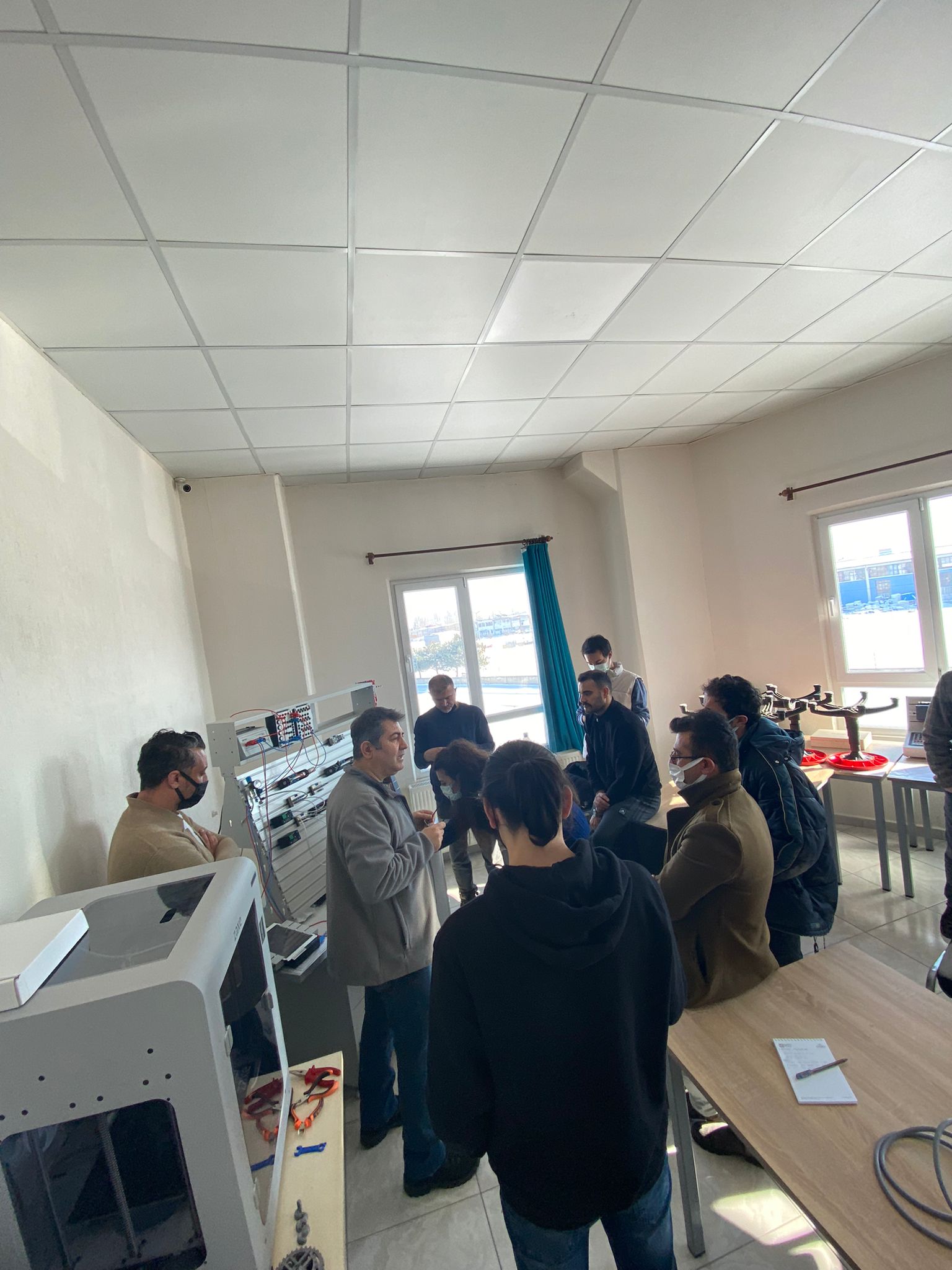 İçerisinde Robot Kol ve Montaj İstasyonu Eğitim Setleri, Endüstri 4.0 Simülasyon Üniteleri, Pnömatik-Elektropnömatik Eğitim Setleri, Proses Kontrol Eğitim Setleri, PLC Eğitim Setleri, Operatör Panelleri, Mikro Denetleyici Eğitim Setleri, 3 Boyutlu Yazıcıların bulunduğu atölye de öğretmenlerin eğitimi son eğitim ile bitti.