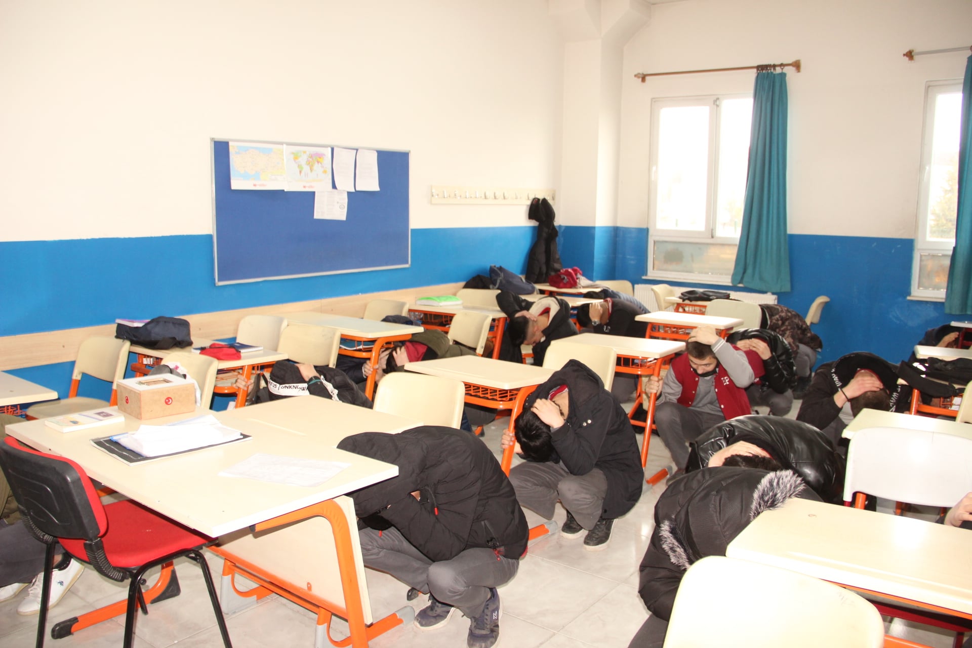 Afyonkarahisar Rahmiye Sare Palalı Mesleki ve Teknik Anadolu Lisesi’nde deprem tatbikatı haftası etkinlikleri kapsamında gerçeğini aratmayan deprem tatbikatı yapıldı. Okul zilinin yerine siren seslerinin yankılandığı okulda öğrenciler sıraların altına girdi.