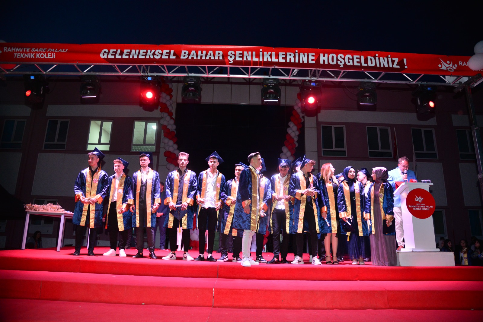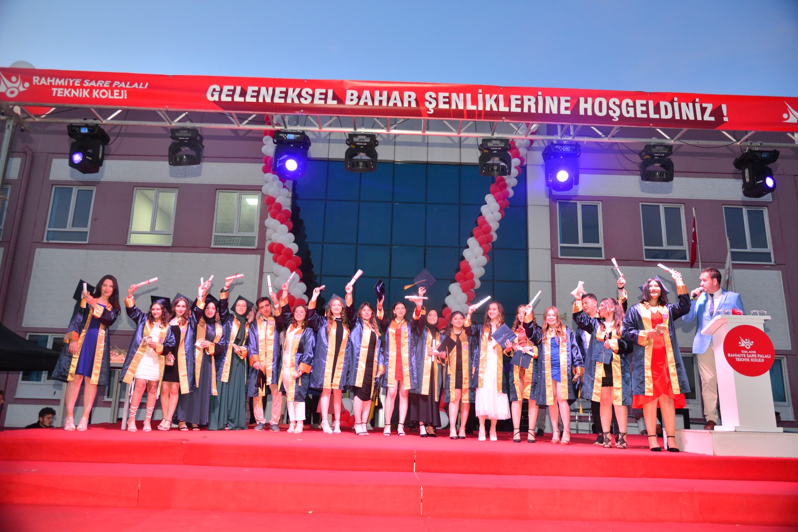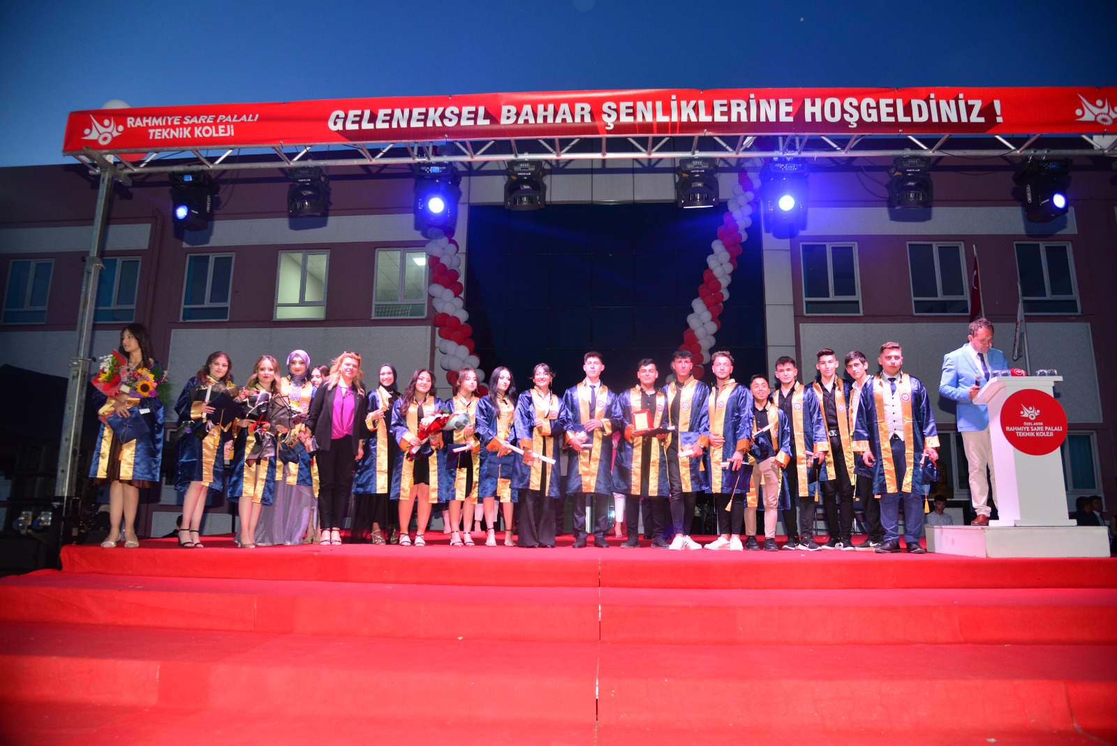 Saygı Duruşu ve İstiklal Marşı’nın okunmasının ardından kurucu okul müdürü Mahmut Önder Artuk öğrencilere hitaben bir konuşma yaptı. Artuk; “Eğitim hayatınızda zorlu geçen 4 yılın ardından bugün mezun olarak geleceğe yeni bir adım atacaksınız. Azim ve Kararlılıkla gelecekte çok başarılı birer insan olacağınızdan şüphemiz yok. Sizlerden isteğimiz temiz ve ahlaklı birer birey olmanın yanında vatana millete ve ailelerinize değer katan hayırlı birer evlat olmanızdır. Sizlerin Özel Rahmiye Sare Palalı Teknik Koleji bünyesinde eğitim görmüş olmanız da bir şanstır. Mezuniyet sonrasında geleceğe atacağınız adımlarla birer mühendis olma imkanına sahip olanlar ile birçok sektörde iş hayatına doğrudan atılma şansına da sahip oldunuz. Geleceğiniz güzel ve başarılarla dolu olsun. Sizlerin her ihtiyacınızda da yanınızda olacağımızı buradan tekrar hatırlatıyorum. Hepinizi tebrik ediyor başarılarınızın devamını temenni ediyorum” dedi.
