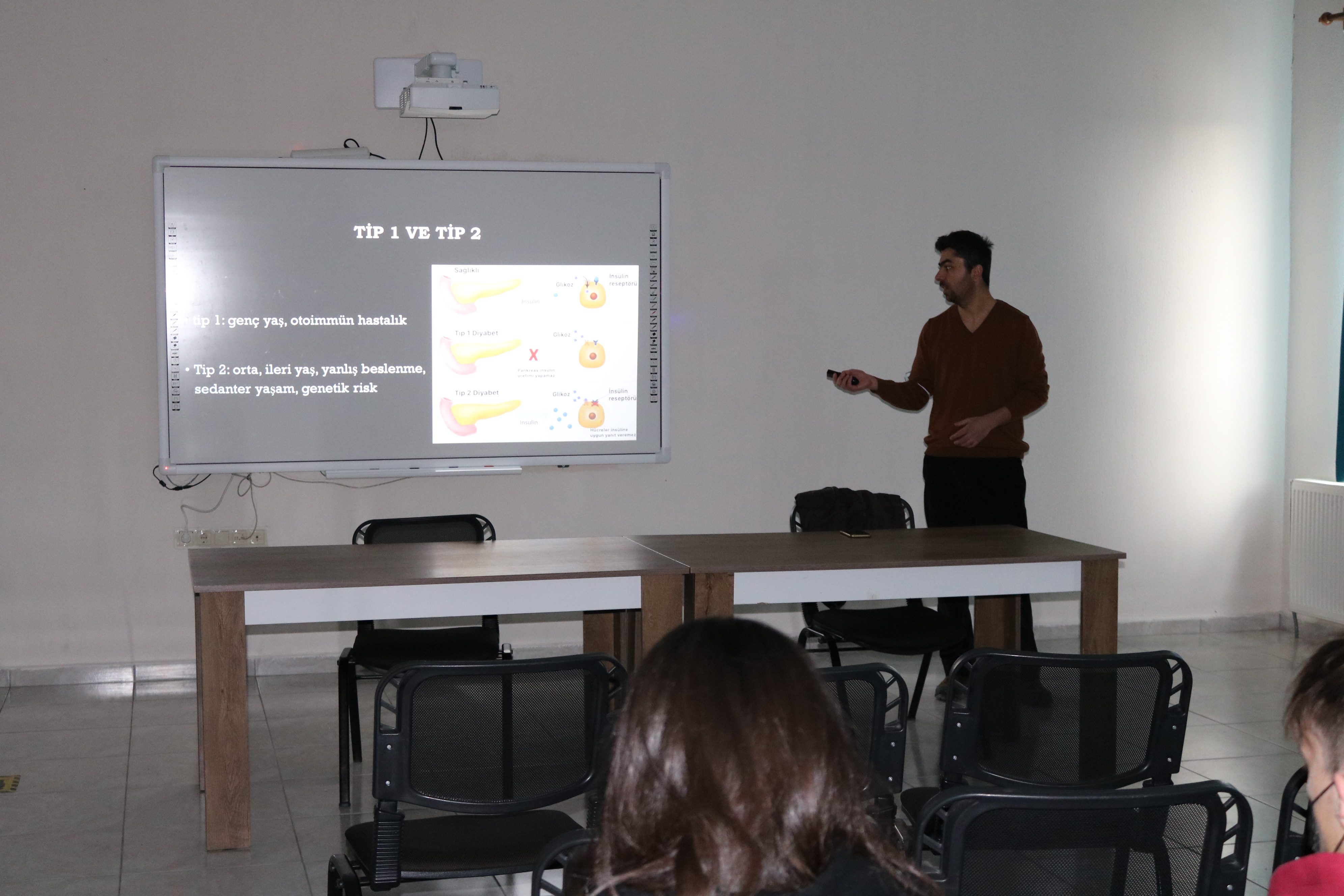 İl Milli Eğitim ve il Sağlık Müdürlüklerinin talebiyle okulumuzda ‘Diyabet nedir? Diyabette beslenme, kronik hastalıklardan korunma yolları.’ konulu sunum yapıldı. Sunum okul doktoru tarafından 11. ve 12. sınıflara yapıldı. Sunumun amacı, diyabetli çocukların erken tanı almasını sağlamak, şeker komasından korunmak, diyabetli çocuklarımıza diyabetini yönetmesinde destek vermek, sağlıklı beslenme tutumu oluşturmak, şişmanlık konusuna dikkatinizi çekmek; sağlıklı beslenme ve fiziksel aktivitenin önemini anlatmak şeklinde ifade edildi. Sunumda diyabetin özellikle düzenli ve dengeli beslenme ile doğrudan ilişkili olduğu; günümüzde pandemi ve sonrasında azalan fiziksel aktivitelerin azalması, fastfood beslenme alışkanlıklarının artması ile artış gösteren bir rahatsızlık olduğundan bahsedildi. Diyabetin Tip-1,Tip-2 ve Tip-3 olmak üç farklı tipi olduğunu ifade eden Doktor ŞAHİN, genetik yatkınlığın hastalığa yakalanma riskini arttırmasının yanında gündelik hayatın mutlaka düzenli bir olması gerektiğini ifade etti. Ayrıca Diyabet’in bulaşıcı bir hastalık olmadığı ve çevremizde bu tür rahatsızlığı olanların bulunabileceği, onların kullandığı ilaç, insülin vb. tedavi süreçlerini normal kabul edip bu insanlara yardımcı olunması gerektiği belirtti.