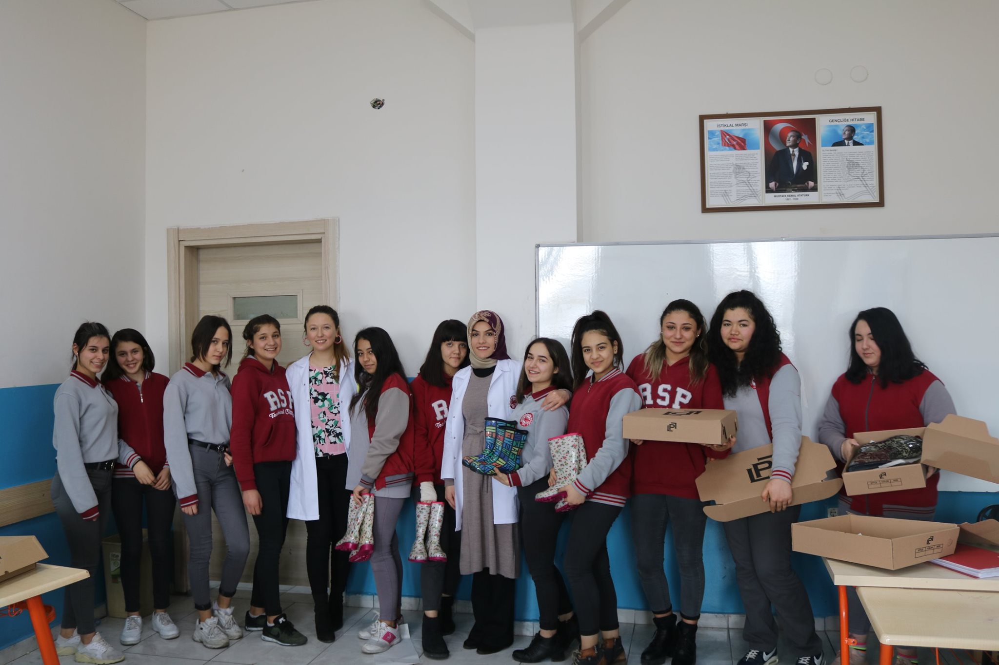 Okul Müdürü İbrahim ÇAKAL; kız öğrencilerimize karne hediye vermek istedik. Bu konuda yaptığımız çalışmalarda kış ayına uygun olarak kız öğrencilerimize çizme ve bot verebileceğimiz fikrini oluşturduk. Bu konuyu paylaştığımız Palalı Lastik ve Çizmenin sahini İsmail PALALI. konuya yardımcı olabileceğini bize iletti. Onun yardımı ile tüm kız öğrencilerimizi bu hediye ile yarı yıl tatiline çıkarmanın keyfini yaşamış olduk."dedi