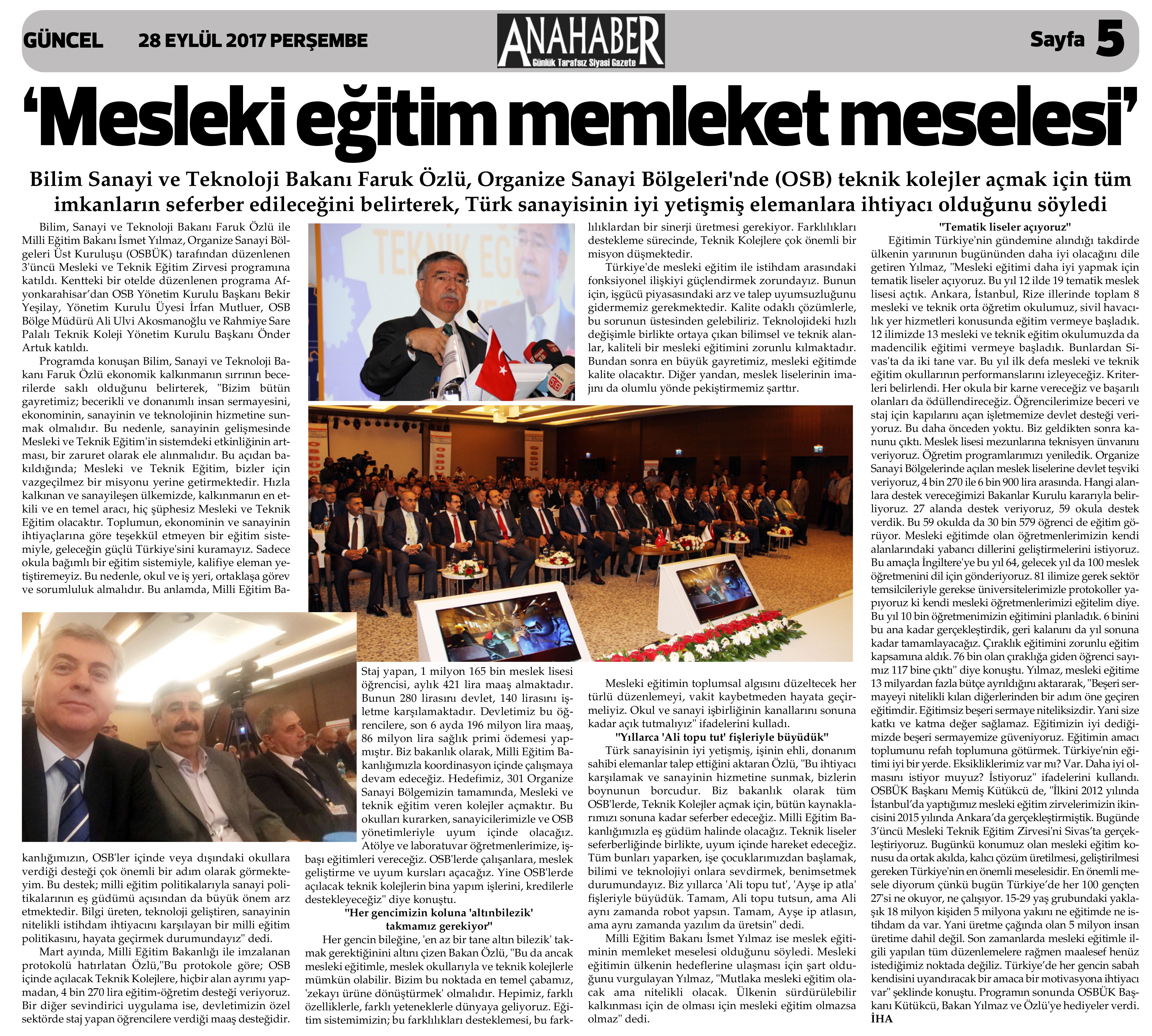 Bilim, Sanayi ve Teknoloji Bakanı Faruk Özlü, OSB içindeki Teknik Kolejlere tam not vererek, her ilde böylesine güzide okulların olması gerektiğini vurguladı.